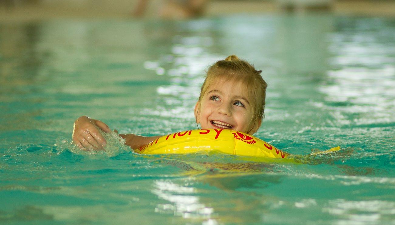 Lächelndes Kind schwimmt im Pool mit gelbem Schwimmreifen